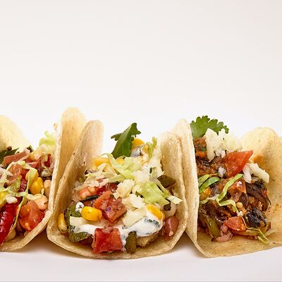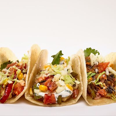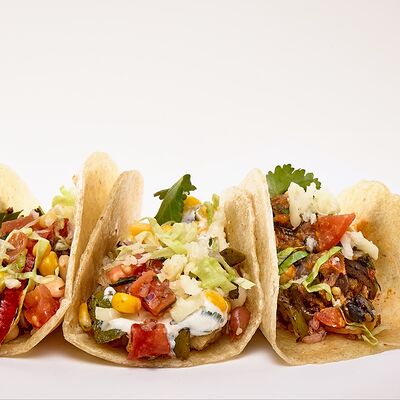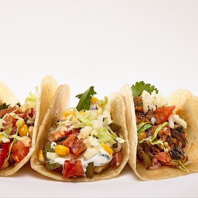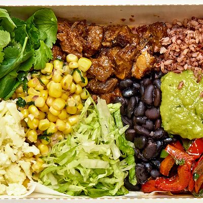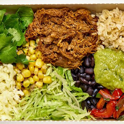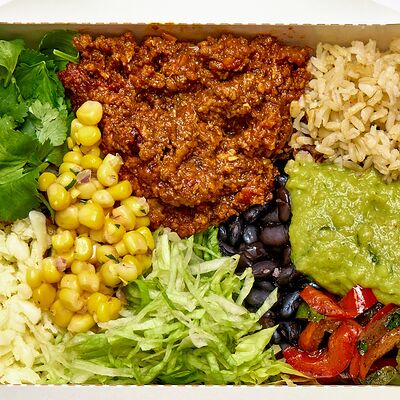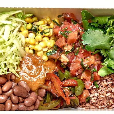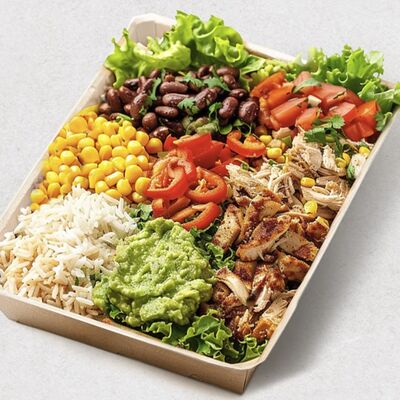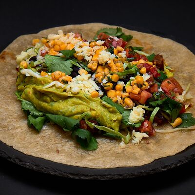 Тортилья, рис, баранина, перец болгарский, фасоль, соус, сальса из кукурузы, сыр моцарелла, салат айсберг, кинза, томатная сальса, гуакамоле