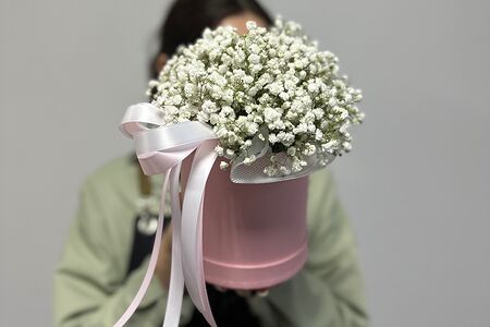 Шляпная коробка с нежной гипсофилой в размере S доставка