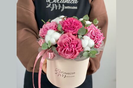 Коробка с пионовидными розами "Кантри Блюз" и хлопком. доставка