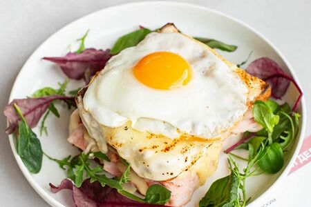 Классический французский сендвич с окороком и сырным соусом бешамель и жареным яйцом. Состав: Бриошь Хоккайдо (мука пшеничная высшего сорта, фермерское молоко 3,5%, фермерские сливки, яйца куриные, сахар, морская соль, дрожжи прессованные), окорок свиной(тазобедренная часть без шкуры (окорок), вода, соль, натуральные специи),масло сливочное, соус бешамель сырный( мука,молоко,масло сливочное ,соль, перец черный, мускатный орех , сыр моцарелла),масло сливочное, микс салат, масло оливковое,сок лимонный, яйцо куриное,соль