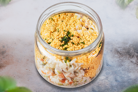 Многолетний и постоянный участник нашего рыбного меню - фирменный салат, который приготовлен из идеального набора сочетающихся между собой разноцветных ингредиентов: красная рыба отлично проявляет себя в компании свежего зеленого огурца, сладкой оранжевой моркови и яйца на фоне