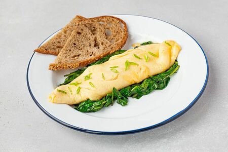 Классический французский омлет со шпинатом и поджаренным деревенским тартином Состав: Яйцо куриное,шпинат,соль,перец,лук зеленый, масло оливковое, масло сливочное, деревенский хлеб( мука в/с, вода, закваска пшеничная, соль) ,соль,перец