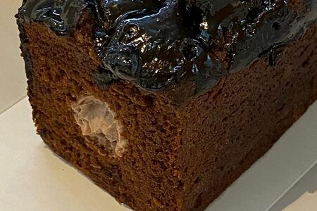 Кофейно-шоколадный кекс с черносливом, грецким орехом и кофейным кремчизом Состав: Масло, какао, тростниковый сахар, чернослив, грецкий орех, мука, сливки, разрыхлитель, кремчиз 64%