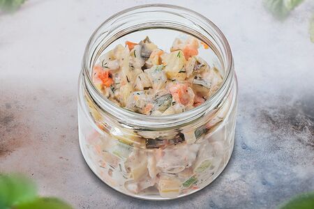 Само название говорит за себя. Без этого салата праздничный стол не может считаться праздничным. Состав: Отварные очищенные овощи (морковь, картофель), огурцы соленые , огурцы свежие, яйцо куриное, отварной куриный окорочок, мясо птицы,соль, перец черный молотый , майонез. Белки - 3,7 Жиры - 12,6 Углеводы - 7,0