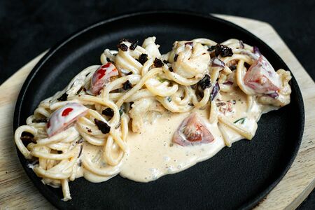 Фирменная паста в сливочно-винном соусе, с лангустинами обжаренными в чесночном масле, помидорками черри, пармезаном и криспи беконом Состав: Свежая паста спагетти, сливки, белое вино, обжаренные лангустины, карамелизированный в сахаре бекон, лук репчатый, масло чесночное, томаты черри, пармезан, кайенский и черный молотый перец, соль