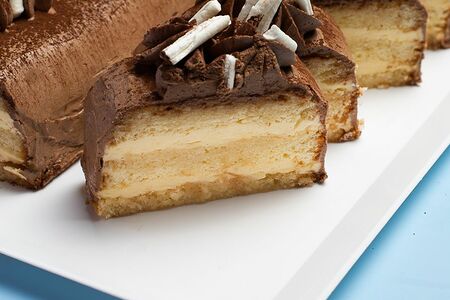 Бисквиты пропитанные в ромовом сиропе и 2 видов крема, ванильный и шоколадный Состав: Мука, яйца, сахар, масло сливочное, ром, ванилин, молоко, какао