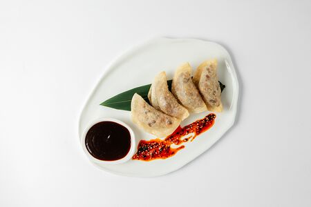 Гедза с начинкой из утки по-пекински, моркови, дайкона, капусты б/к и грибов шиитаки, с устричным соусом и чесноком. Поливается чили маслом и подается с соусом дрессинг.