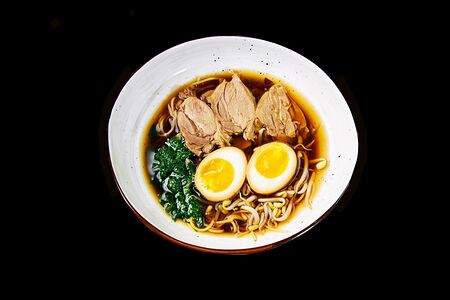 Наваристный утиный бульон мы варим 7 часов, добавляем пеничную лапшу ручной работы, ростки сои, утку по-пекински, маринованное яйцо сваренное всмятку, шпинат, украшаем ломтиками красного перца и лепестками нори и получаем великолепный оригинальный DUCK Рамен. Состав: Утиный бульон, пшеничная лапша, утка , шпинат, ростки сои, маринованое куриное яйцо, нори, чили пеец.