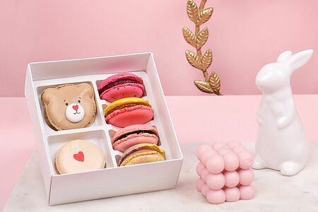 В составе набора пирожные макарон: Светлый Мишка (1 шт.), Ваниль с сердцем (1 шт.), Ягодный чизкейк (1 шт.), Малина с базиликом (1 шт.), Лаванда с лимоном (1 шт.), Ананасы в шампанском с кокосовым кремом (1 шт.)