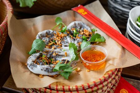 Три блинчика из рисового теста с начинкой из свинины, черных грибов, лука репчатого, соус "Ныок Чам"