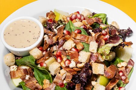 микс салатов, чипсы из бекона, яблоко, кешью, грецкий орех, гранат, крутоны и медово-горчичный соус с арахисовой пастой