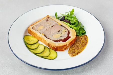 Традиционный французский пирог c тестом бризе и начинкой из паштета утки и свинины, филе утиной грудки, клюквы в коньяке, фуа-гра и вишневым желе. Подается с микс салатом, пиклз и соусом из дижонской горчицы. Состав: Утка,свинина, масло сливочное,мука ,яйцо куриное,соль,сахар ,желатин,утиный жир,перец черный,кумин,кориандр,эспелетский перец, клюква, коньяк, микс салат ,фирменные пиклз ( огурец,горчица дижонская, лук репчатый, уксус рисовый,соль, сахар), дижонская горчица ,уксус рисовый,мед.