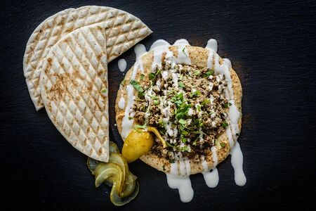 Хумус с обжаренным на гриле говяжьим фаршем и соленьями. Подается с питой на тарелке.