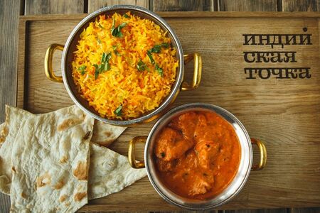 Кусочки куриного филе в пряном сливочном соусе с ароматным маслом и специями. Подается с рисом, салатом и лепешкой Наан.