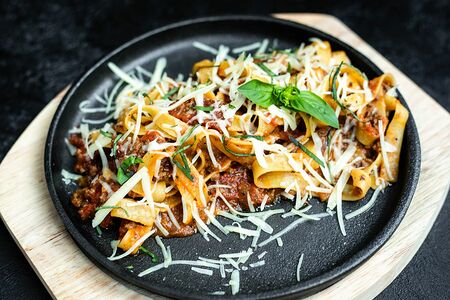 Спагетти с фирменным мясным рагу в томатном соусе. Состав: Спагетти, фарш из говядины, томленый в томатном соусе и красном вине, орегано, майоран, лук, чесночное масло, пармезан, черный молотый перец, соль белки 4, жиры 7, угл 8