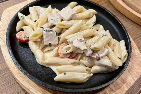 Пенне с запеченной индейкой и помидорками черри в соусе на основе сливок