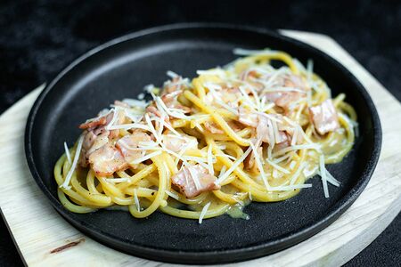 Карбонара по классическому римскому рецепту готовится без сливок, на желтковой эмульсии с беконом и пармезаном Состав: Свежая паста спагетти, бекон, пармезан, куриные яйца, чесночное масло, черный молотый перец, соль белки 13, жиры 13, угл 18