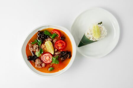 Утиный бульон, специи том ям, лемонграсс, галангал, кокосовое молоко, рыбный соус, утка по-пекински. Подаётся с лаймом и настоящим рисом "Шинаки". Состав: Бульон том ям, рис, лайм, грибы древесные, кинза, утка, томаты черри.