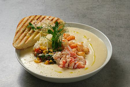 Рыбный бульон, кукуруза, сливки, краб, креветки, пармезан. Подается с домашней фокаччей.