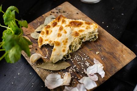 undefined Состав: Слоеное тесто, репчатый лук, кинза, петрушка, укроп, зеленый лук