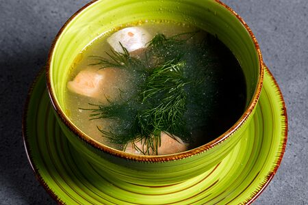 Уха из двух видов рыб. Состав: Рыбный бульон,лосось,зубатка,картофель,морковь,лук,зелень и специи.