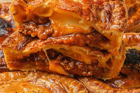Традиционный австралийский пай с двумя видами теста — песочным и слоеным, с начинкой из говяжьего фарша в густом томатном соусе на красном вине.