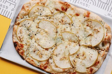 Пицца "Свит блюз" полностью оправдывает свое название - это сочетание терпкой горгонзолы и сладкой груши, которое превосходно дополняется нежной моцареллой.