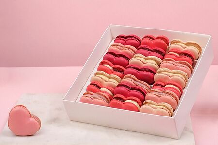 В составе набора пирожные макарон: Пирожное макарон Сердце красное (6 шт.), Пирожное макарон Сердце розовое (5 шт.), Пирожное макарон Сердце жемчужное (5 шт.), Пирожное макарон Сердце фуксия (5 шт.)