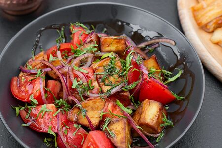 Поджаренные хрустящие баклажаны со свежими томатами, красным луком, зеленью, под соусом наршараб, растительным маслом. Состав: (Баклажан, помидор, лук красный, зелень (укроп/петрушка), соус наршараб, крахмал, масло растительное, соль, черный перец)