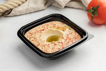 Закуска из нутового пюре, в состав которой входят кунжутная паста, оливковое масло, чеснок, сок лимона, паприка. Состав: горох нут, кунжутная паста, оливковое масло, лимонный сок, чеснок, зира, 2 арабские питы Б- 19, Ж - 39, У - 42