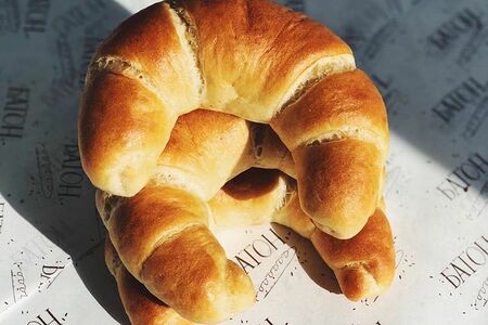 Классический рогалик без начинки. Состав: Состав: Мука пшеничная в/с, молоко, сахар, соль, дрожжи, пулиш, мёд, растительное масло Пищевая ценность: белки 7,7, жиры 20,5, углеводы 50,1.