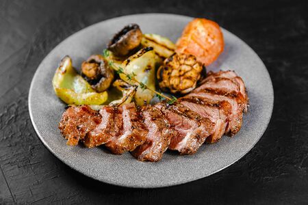 Стейк из мраморной говядины. Гарнир на выбор: картофель по деревенски или овощи гриль. С овощами - 200 гр./150гр. 654ккал; С картошкой 200 гр./200гр. 791 ккал.
