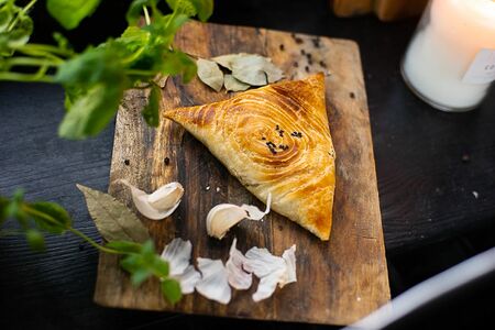 Выпечка с мясом из печи. Состав: Слоеное тесто, говядина, репчатый лук