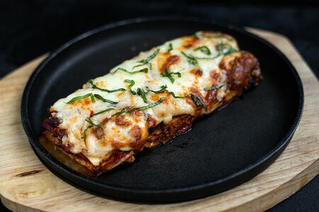 Порция домашней лазаньи с мясным рагу, моцареллой, пармезаном в томатном соусе Состав: Свежая паста листы лазаньи, томатный соус, базилик, мясное рагу из говядины, красное вино, моцарелла, пармезан, соус бешамель Ккал 120, белки 5, жиры 5, угл 8