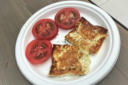 Жаренные кусочки сыра халуми, подаются с отборными томатами. Состав: сыр халуми, томаты Б - 25, Ж - 19, У - 46