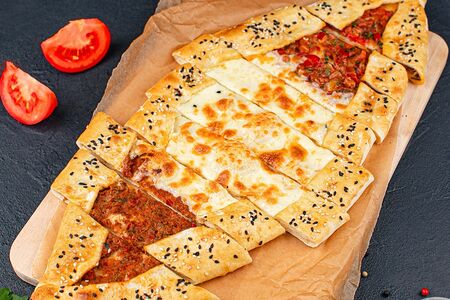 сочный фарш и ломтики мяса и петрушкой на лодочке из нежного теста Состав: Тесто: мука пшеничная, яйцо куриное, вода питьевая, соль, фарш (мясо говядины, лук репчатый, помидор,болгарский перец, томатная паста, масло растительное, петрушка, соль, черный перец В 100 г: белки - 6,7 г, жиры - 3,7 г, углеводы - 23,0 г