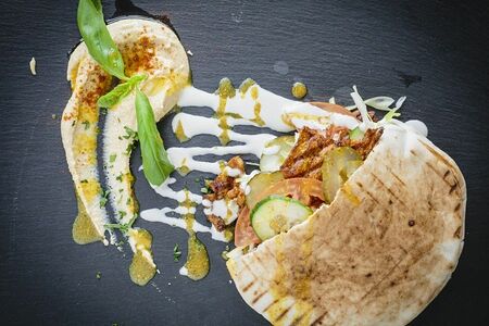 Обжаренная в специях курочка со свежими овощами и солениями. Подаётся в пите, либо на тарелке.