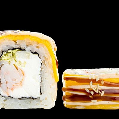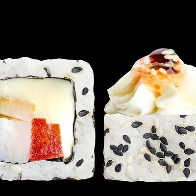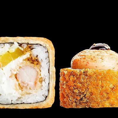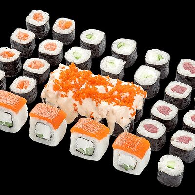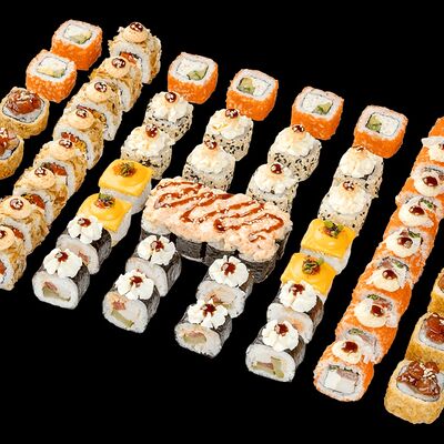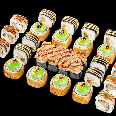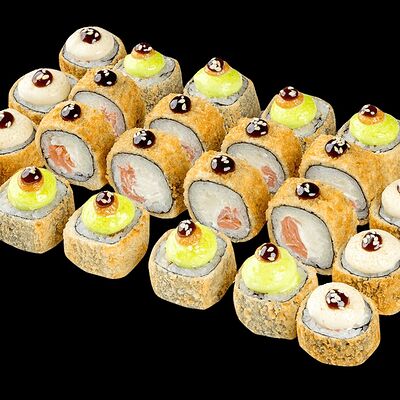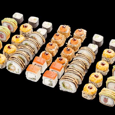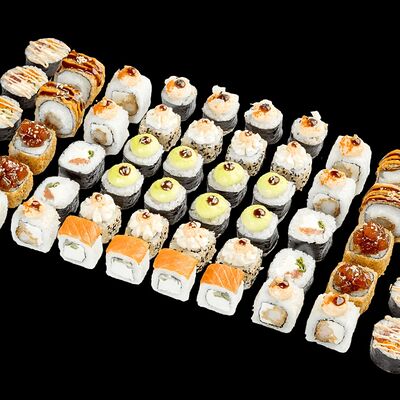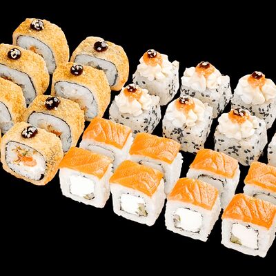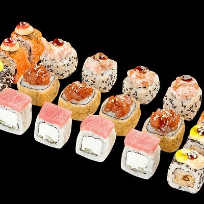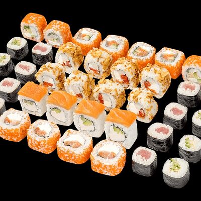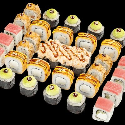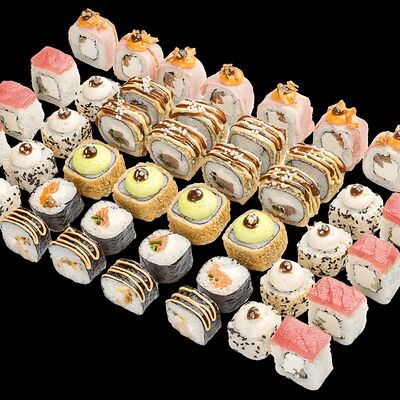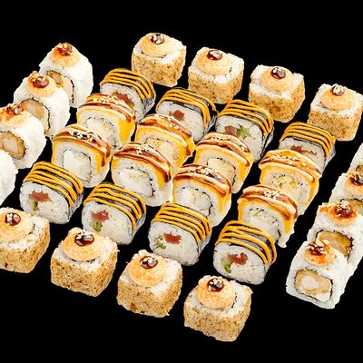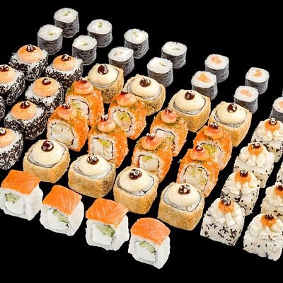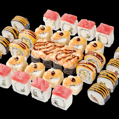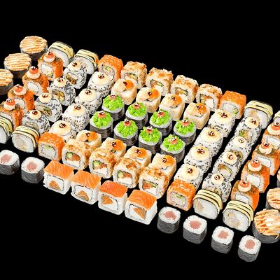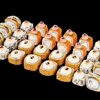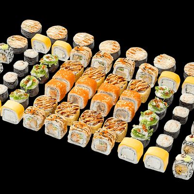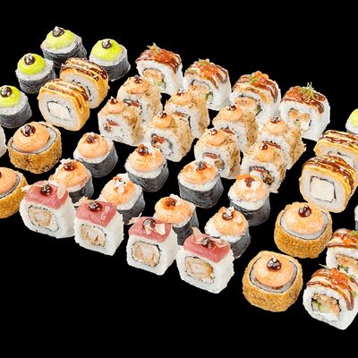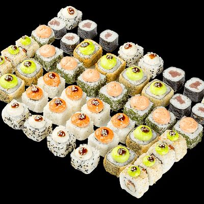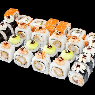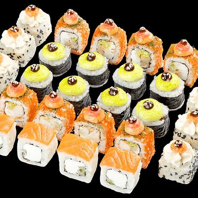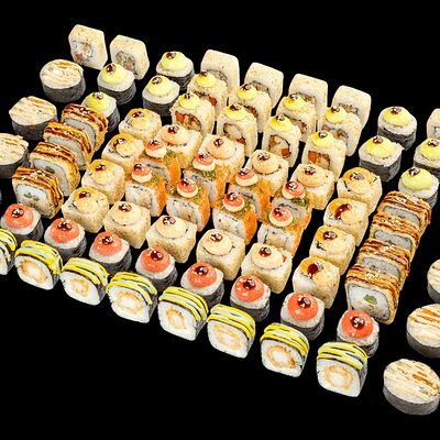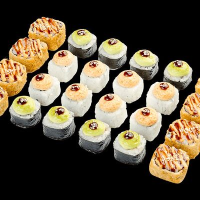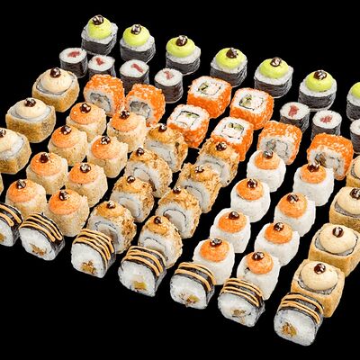 Ролл с креветкой (рис, креветка вареная, нори), Техасская резня (сыр сливочный, филе куриное варено-копченое, помидор, кляр, сухари панировочные, соус гриль Heinz, соус унаги, белый кунжут, рис, нори), Моргана (мидии, кальмар жареный, пекинская капуста, чесночный соус, соус Цезарь, соус унаги, рисовые шарики, черный кунжут, нори), Звездопад (тунец, сыр сливочный, салат чука, соус гамадари, икорный соус имитированный, рис, нори), Лава (креветки темпура, огурец, соус спайси, икра масаго оранжевая, лук фри, сыр сливочный, черный кунжут, рис, нори), Сырный (сыр сливочный, сыр моцарелла, соус сырный, сырные слайсы, рис, нори), Зен (шампиньоны темпура, икра масаго оранжевая, сыр сливочный, рис, нори), Кимпаб с курицей (жареная курочка, сыр сливочный, огурец, морковь, рис, нори под соусами спайси и кимчи) (64 шт.)