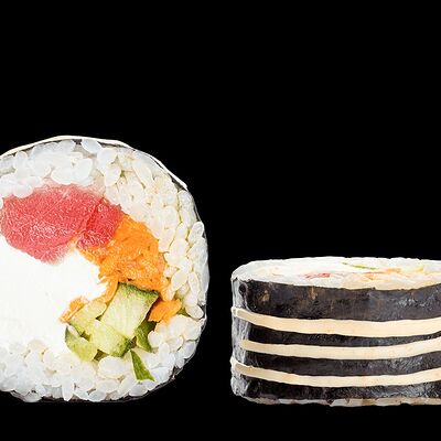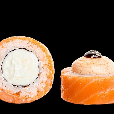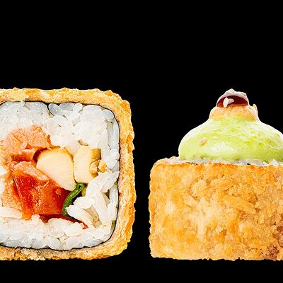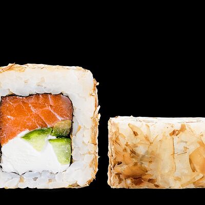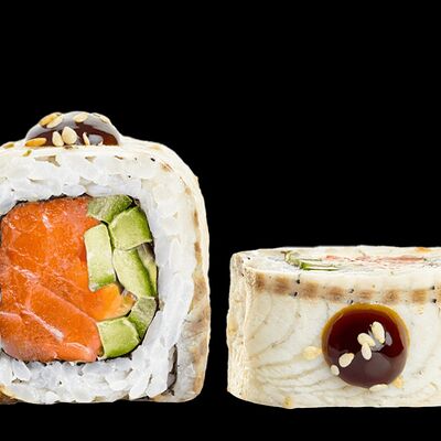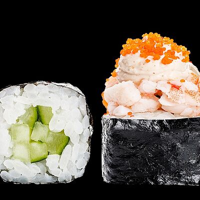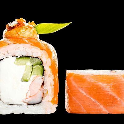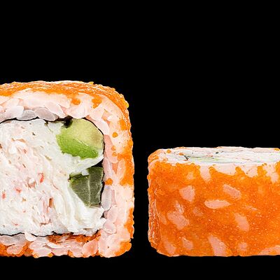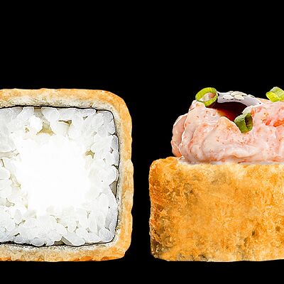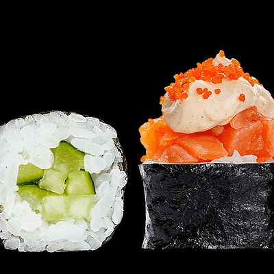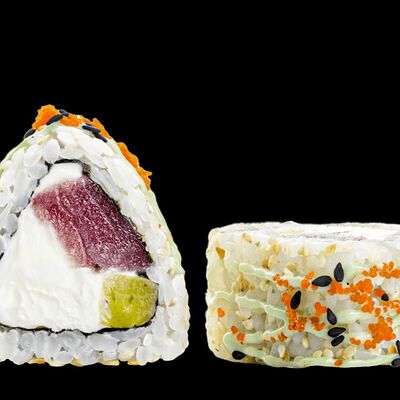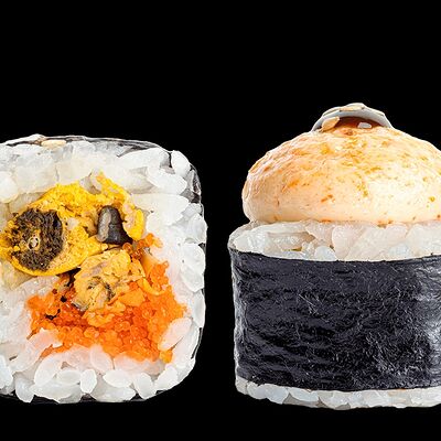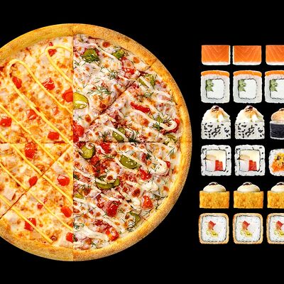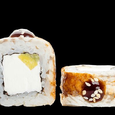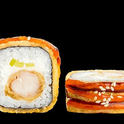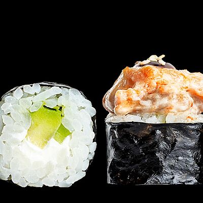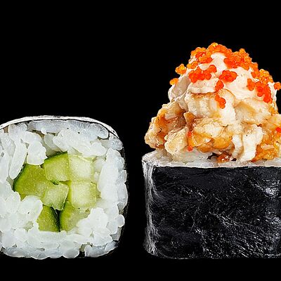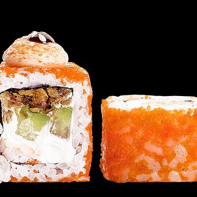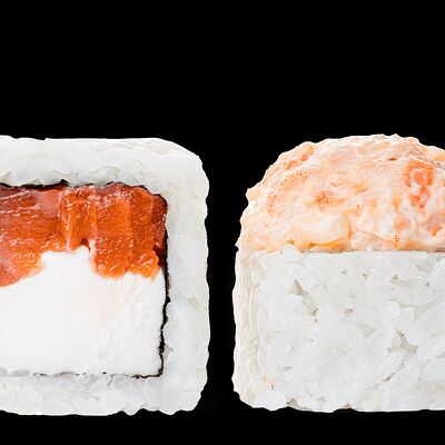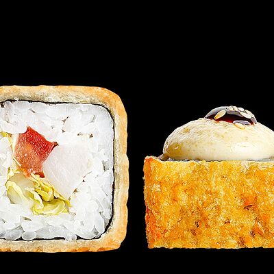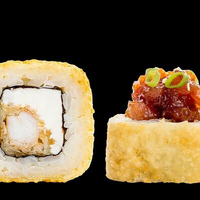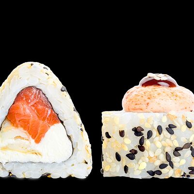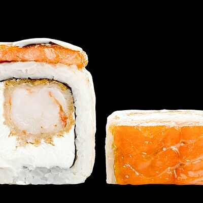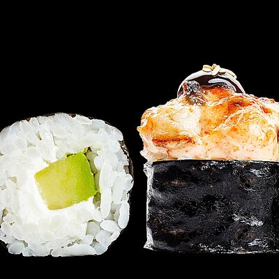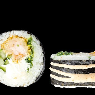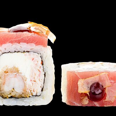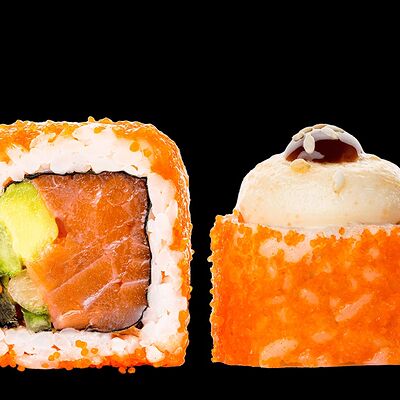 Ролл с креветкой (рис, креветка вареная, нори), Техасская резня (сыр сливочный, филе куриное варено-копченое, помидор, кляр, сухари панировочные, соус гриль Heinz, соус унаги, белый кунжут, рис, нори), Моргана (мидии, кальмар жареный, пекинская капуста, чесночный соус, соус Цезарь, соус унаги, рисовые шарики, черный кунжут, нори), Звездопад (тунец, сыр сливочный, салат чука, соус гамадари, икорный соус имитированный, рис, нори), Лава (креветки темпура, огурец, соус спайси, икра масаго оранжевая, лук фри, сыр сливочный, черный кунжут, рис, нори), Сырный (сыр сливочный, сыр моцарелла, соус сырный, сырные слайсы, рис, нори), Зен (шампиньоны темпура, икра масаго оранжевая, сыр сливочный, рис, нори), Кимпаб с курицей (жареная курочка, сыр сливочный, огурец, морковь, рис, нори под соусами спайси и кимчи) (64 шт.)