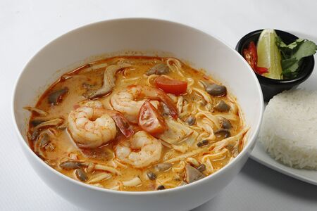 Тайский куриный бульон на кокосовом молоке, креветки, кальмары, грибы, томаты черри, рис