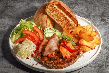 Внутри котлеты из рубленой телятины кубиками порезан сыр Качкавал. Подается с картофелем по-деревенски.