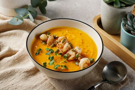 Тыквенный крем-суп с креветками, тыквенными семечками и трюфельным маслом