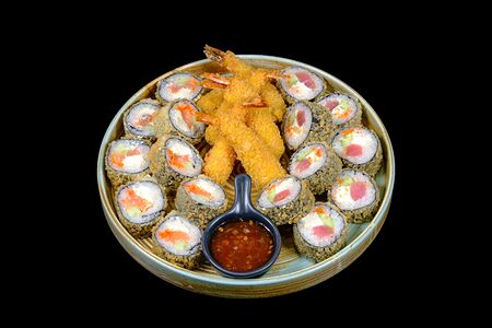 Горячий ролл с тунцом-8шт. Горячий ролл с лососем-8шт. Хрустящие креветки-6шт.