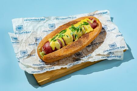 С колбаской из мраморной говядины, булочкой, салатом, красным и зеленым луком, маринованными огурчиками и медово-горчичным соусом