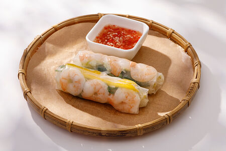 Спринг-роллы с креветками, рисовой лапшой Бун, манго и зеленью. Подаются с соусом Ныок Мам. 2шт.