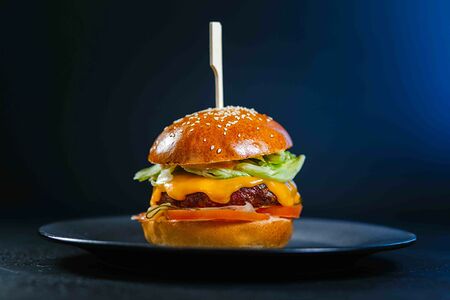 Булочка с кунжутом, лук красный, сыр чеддер, томаты, огурцы маринованные, салат айсберг, котлета из мраморной говядины, классический розовый соус. Прожарка Medium