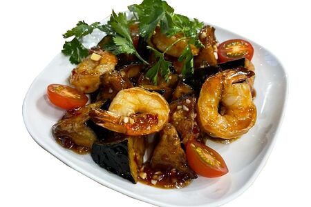 Хрустящие баклажаны в фирменном тайском соусе с креветками, зеленью и томатами черри