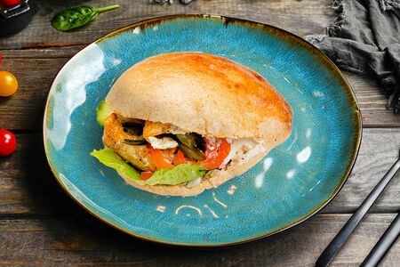 Куриное филе, овощи, соусы сальса и чесночный в пите.