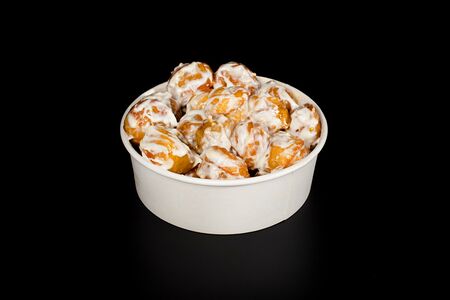 Жареные пельмени с начинкой из курицы и пармезана под сметано-горчичном соусом.