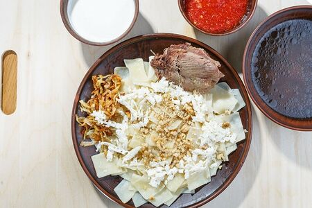 Тонкое тесто с говяжьим фаршем, сыром брынза, орехом и луковой поджаркой